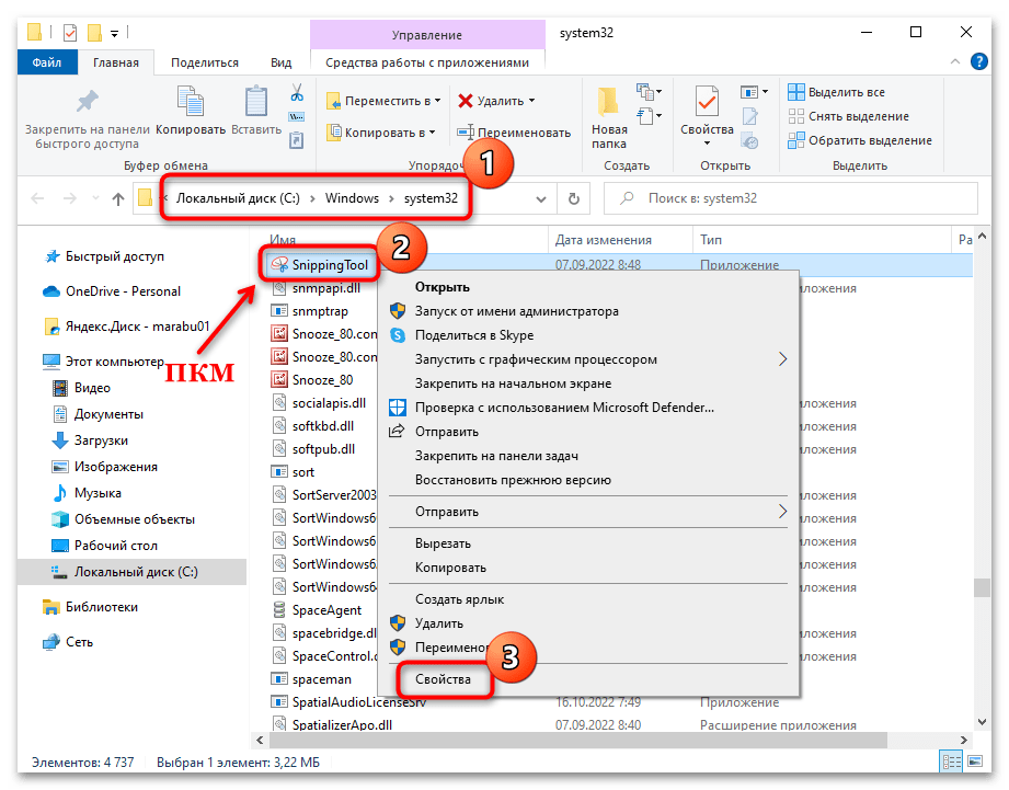 Сквозь «Проводник» перейдите по пути C:Windowssystem32. В перечне найдете приложение «SnippingTool» и кликните по нему правой кнопкой мыши. Из контекстного окна изберите «Свойства».