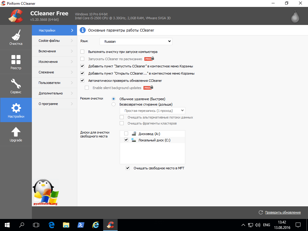 Следующим пунктом ccleaner для Windows 10 будет пункт Настройки, тут вы можете изменить язык интерфейса утилиты, настроить режим очистки.