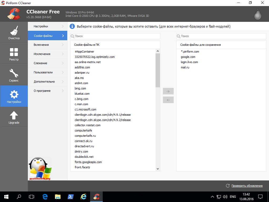 В окне вы увидите два списка. Левый список — список всех «куков» посещенных вами сайтов. Список в правой части окна содержит в себе cookie, которые CCleaner удалять не будет.