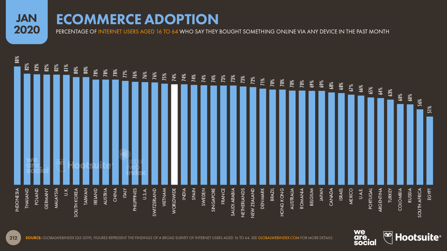 Примерно три четверти интернет-пользователей в мире в возрасте от 16 до 64 лет ежемесячно покупают что-то в онлайне. По данным GlobalWebIndex, уровень проникновения ecommerce самый высокий в Индонезии, Таиланде и Польше. Это говорит о том, что экономическое развитие не является основным фактором, определяющим популярность электронной торговли. Другие факторы не менее важны — например сайты, которые обслуживают языковые потребности и культурные предпочтения местных покупателей.
