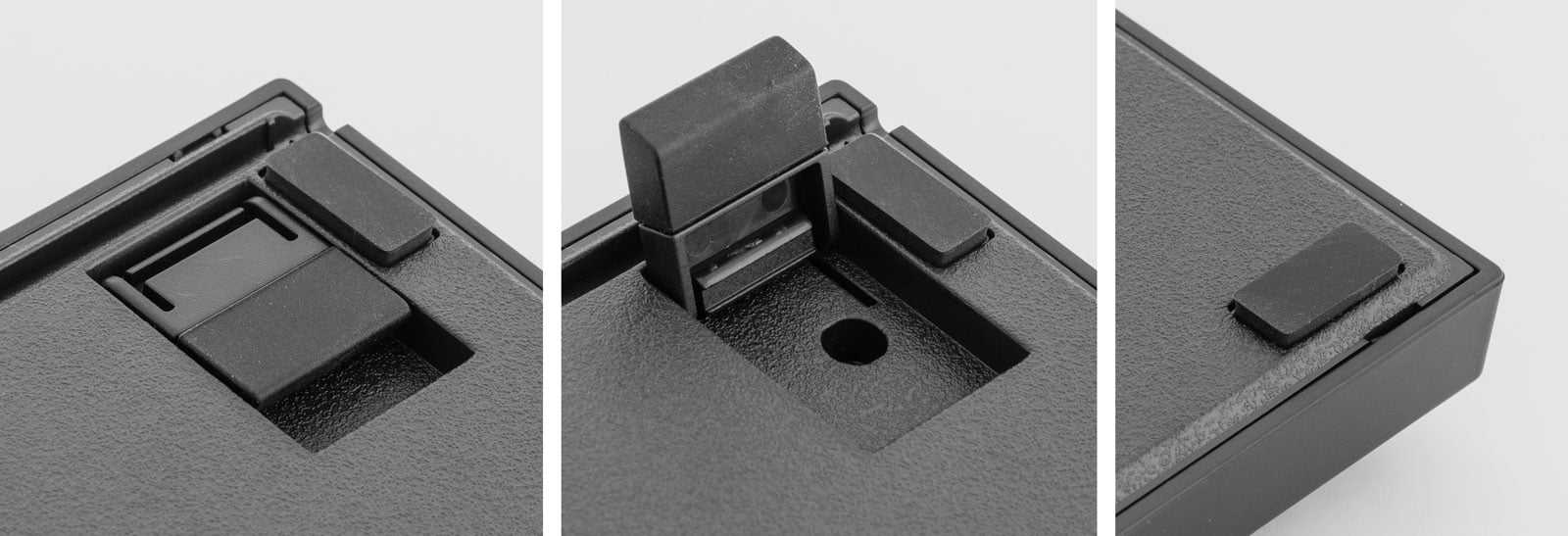 Основание тоже пластиковое. По углам размещены четыре ножки из эластичной резины. Из такого же материала выполнены основания раскладных подставок. Интересно то, что резиновая часть сделана в виде насадки, а не приклеена к конструкции.