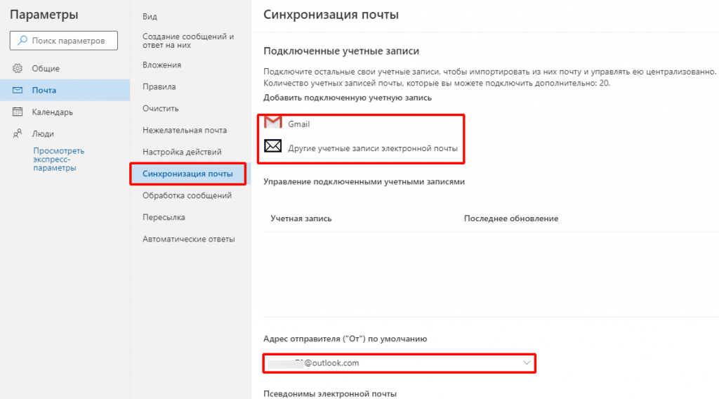 В настройках почтового сервиса Outlook можно синхронизировать папки других электронных ящиков. Для этого перейдите в раздел “Синхронизация почты” и заполните предложенную анкету.