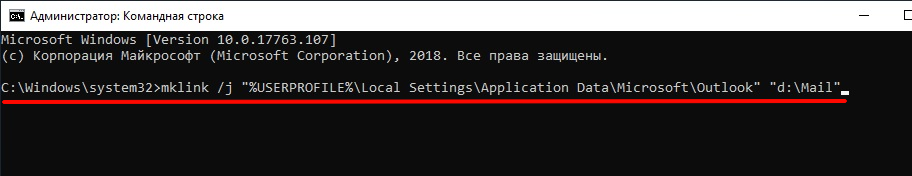 - В командной строке прописываем текст, где “d:\Mail” — это новое расположение папки с файлами Outlook.