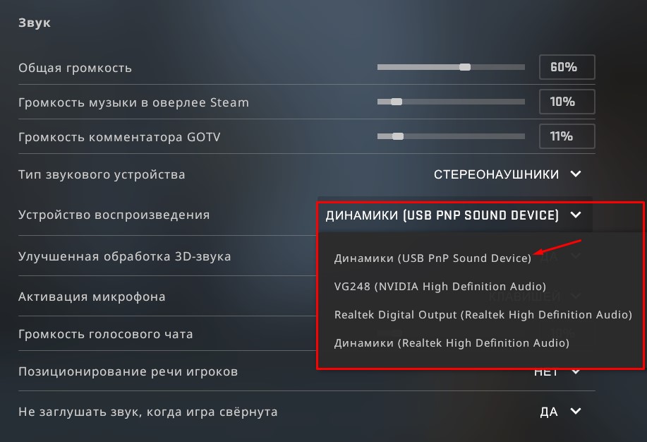 В настройках звука также проверьте источник (скриншот выше) — от куда игра получает звук вашего микрофона. Это настраивается в разделе «Устройство воспроизведения».