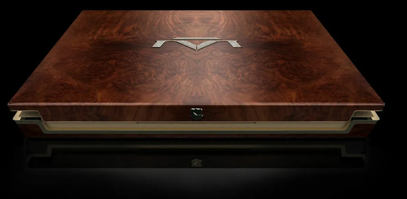 Британские специалисты сотворили роскошное устройство, украсив его клавиатуру драгоценными камнями и настоящим золотом. Ценнейшие сорта древесины и настоящее золото с элементами бриллиантов в совокупности с техническими возможностями модели образовали ошеломляющую цену – 1 млн. долларов. Корпус эксклюзивного ноутбука сделан из натурального дерева. Клавиша пуска имеет золотое напыление и оформлена большим бриллиантом высочайшего качества.