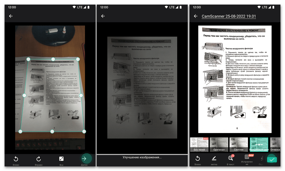 После захвата изображения камерой устройства в CamScanner активизируются интеллектуальные алгоритмы обработки первого — автоматически определяются границы страницы (при этом предоставляется возможность внести коррективы), исправляется перспектива документа и выполняется оптимизация цветности. В результате получается снимок, который фактически не уступает по качеству и пригодности к дальнейшей обработке (например, распознаванию и извлечению текста) получаемым с помощью реального планшетного сканера.