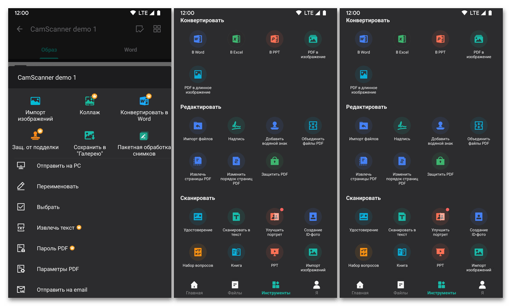 Практически всё в CamScanner направлено на ускорение и упрощение выполнения работ по преобразованию данных из физического в электронный вид, а также автоматизацию рутинных действий. Так, бумажные документы можно сразу сканировать в редактируемый текст или файлы форматов MS Word, Excel и Power Point; в сканере имеются отдельные инструменты для оцифровки книг, получения электронных копий удостоверений личности, средства создания фото на документы и улучшения портретных фотографий. Кроме прочего есть возможность расшифровки QR-кодов, и даже Мастер создания поздравительных открыток.