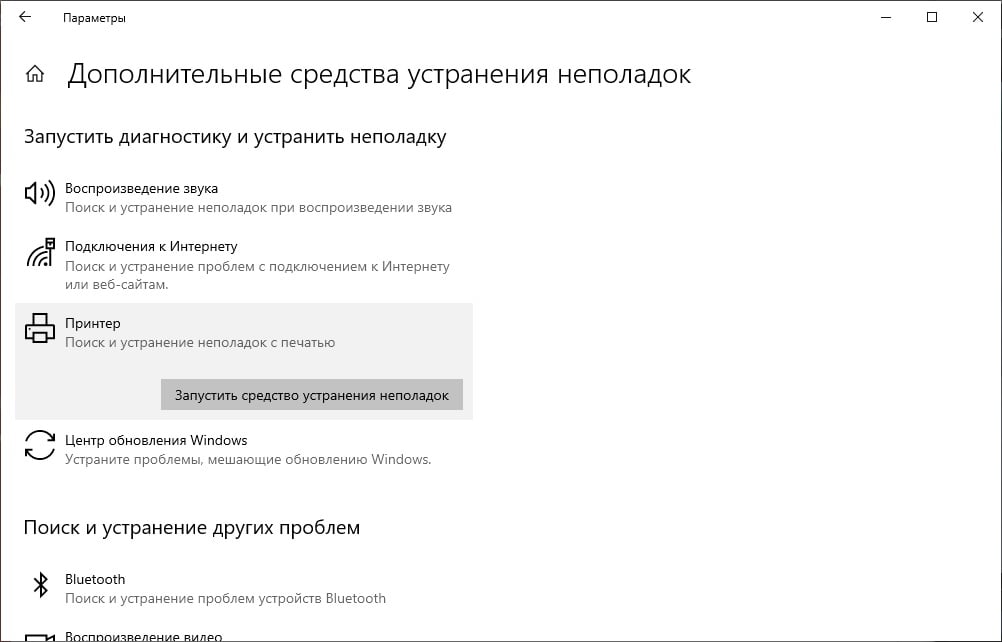 - В разделе «Другие средства устранения неполадок» выберите «Принтеры» и нажмите на кнопку «Запустить устранение проблем».