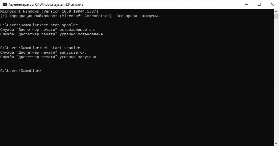 Чтобы вы долго не думали: первой командой мы приостановили работу службы диспетчера печати, второй — снова ее запустили. Завершив манипуляции в Командной строке, проверьте, были ли исправлена 0x00004005 или нет.