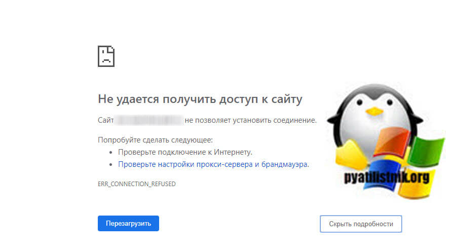Захотелось мне по работе открыть один из сайтов и вместо привычной мне картины я увидел ошибку «Сайт не позволяет установить соединение ERR_CONNECTION_REFUSED». Я сначала подумал, что сам сайт не работает, но команда Ping и проверка портов показывала, что он живой.