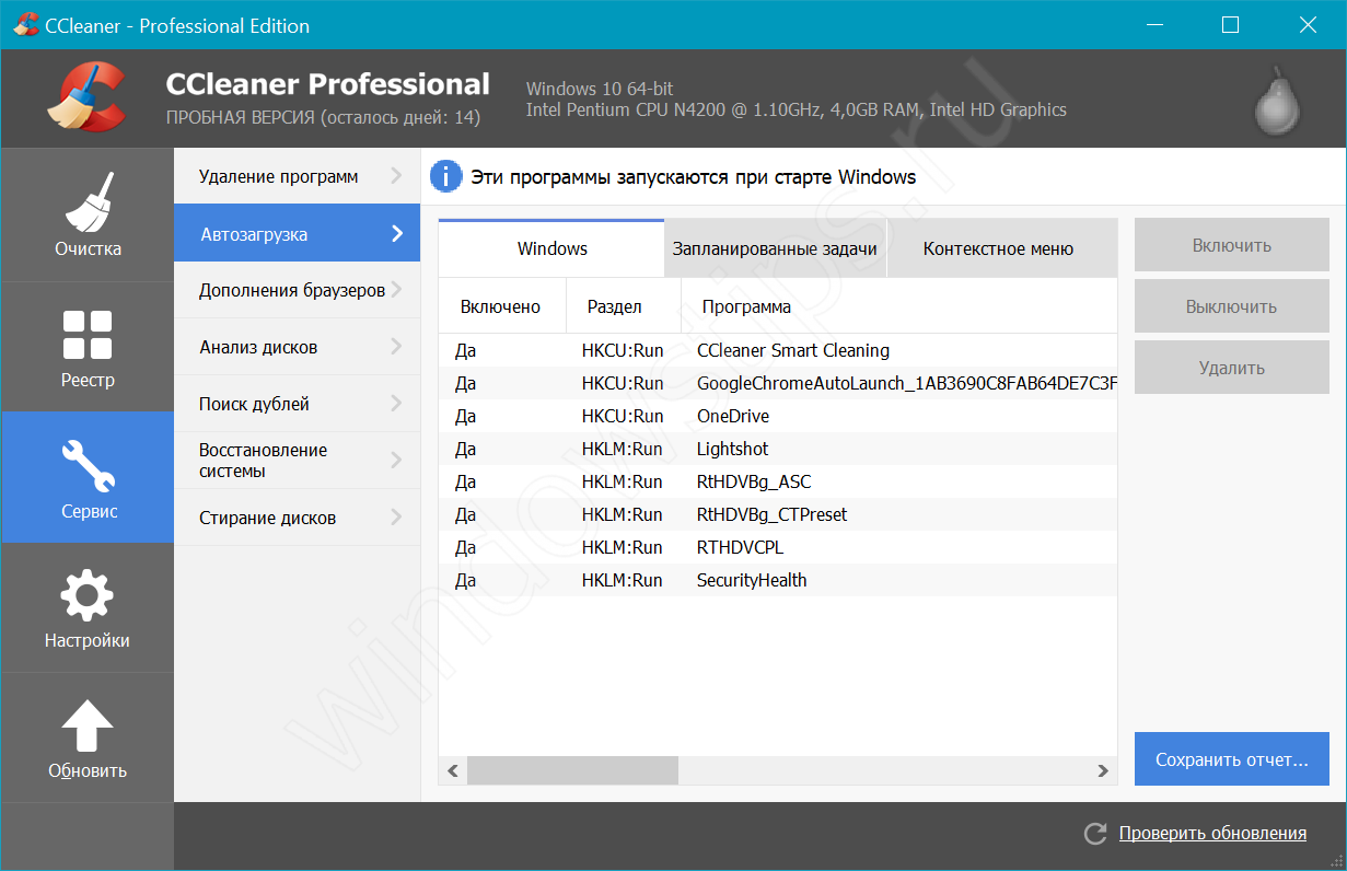 Данная программа платная, но предоставляет возможность испробовать ее с помощью временной версии. Интерфейс полностью на русском языке. Чтобы использовать утилиту для удаления ненужных инструментов из автозапуска, проделайте следующие шаги: