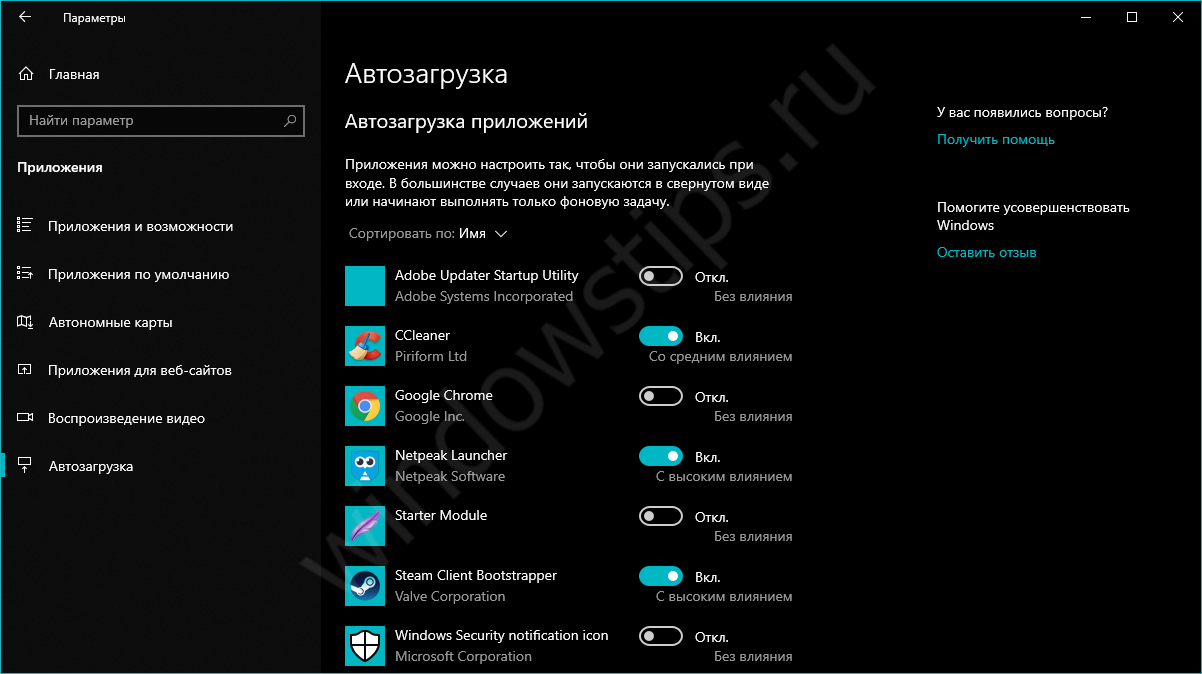Начиная с версии системы Windows 10 под номером 1803, в параметрах Windows можно найти настройку автозагрузки приложений.