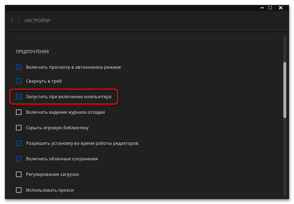 Далее остается только открыть категорию с требуемыми настройками и найти там параметр, отвечающий за включение при запуске Windows 10. Обычно он называется «Автозагрузка», «Запустить при включении компьютера» или «Запускать вместе с Windows». Снимите галочку или деактивируйте переключатель, чтобы добиться нужного эффекта.