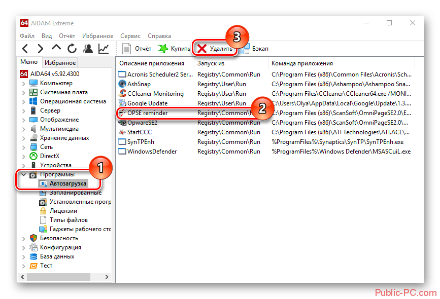 - В появившемся списке выберите ту утилиту, которую необходимо удалить из автостарта. Вверху окна нажмите клавишу «Удалить».