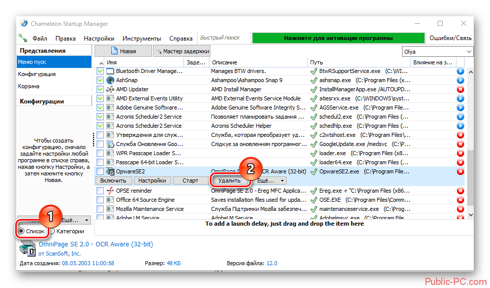 - С главного меню перейдите в «Список», который находится в нижнем углу слева, и отметьте ненужную утилиту.