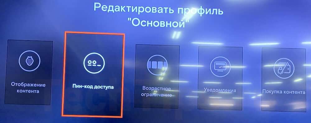 Для смены пин-кода зайдите в основной профиль. На телевизоре «Мое» — «Родительский контроль», на телефоне выбранный профиль находится сверху в меню. Нажмите на «Пин-код доступа». Сначала введите старый пин-код, по умолчанию 0000, затем новый.