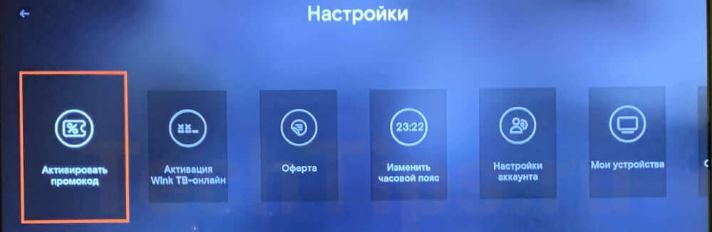 Для этого в телевизоре зайдите в «Мое» — «Настройки» — «Активировать промокод». В телефоне, на планшете и на сайте этот пункт находится в основном меню.