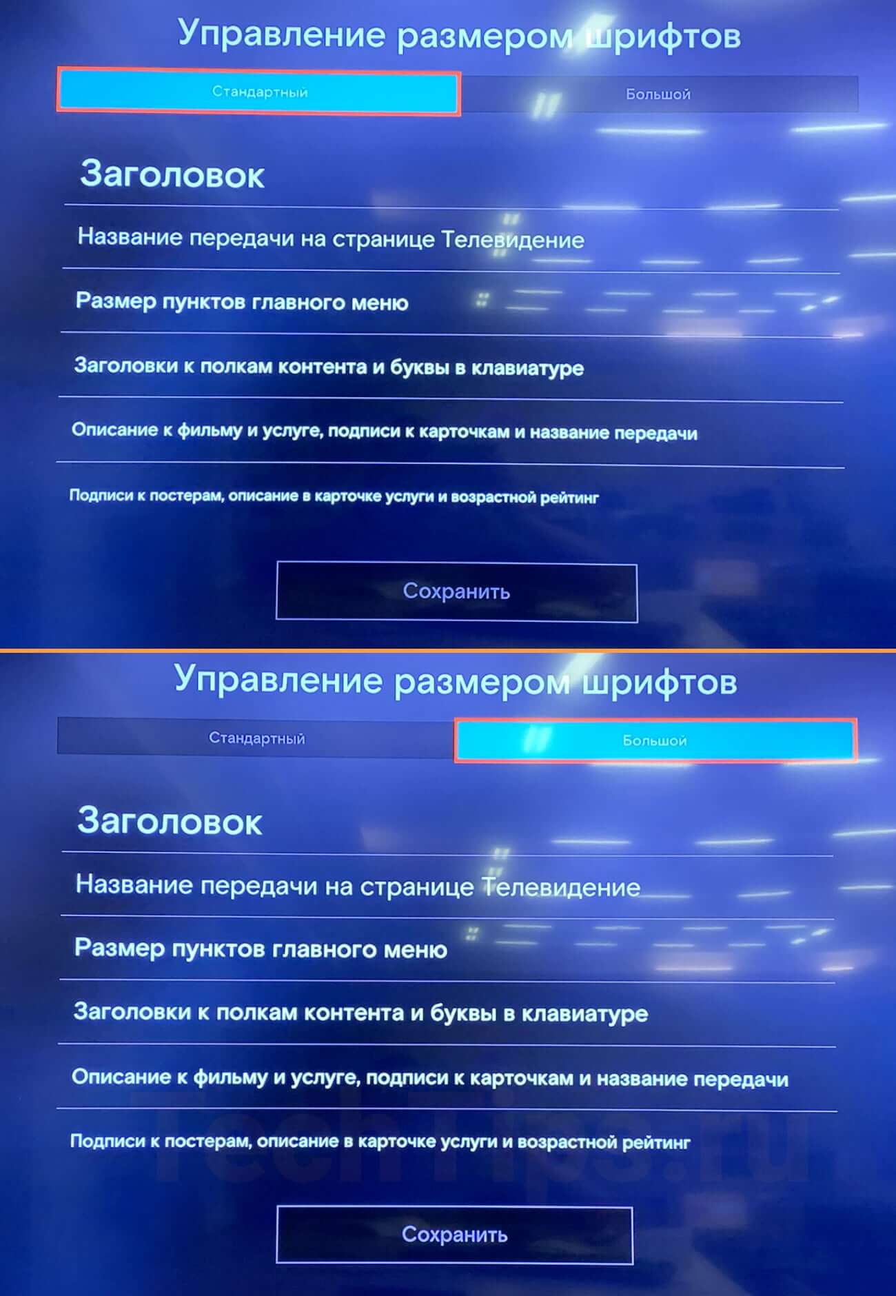 Позволяет увеличить или уменьшить размер шрифта — заголовки, названия передач, пункты главного меню и т. д.