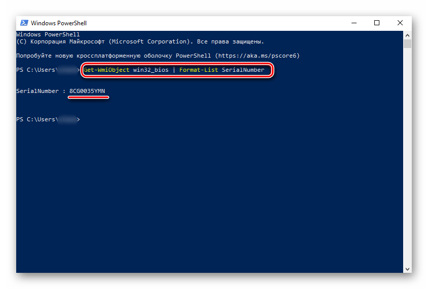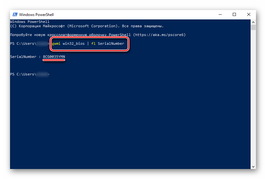 Если у вас по каким-то причинам предыдущая команда не работает, можете воспользоваться ее аналогом — gwmi win32_bios | fl SerialNumber . Результат, как видите, тот же.