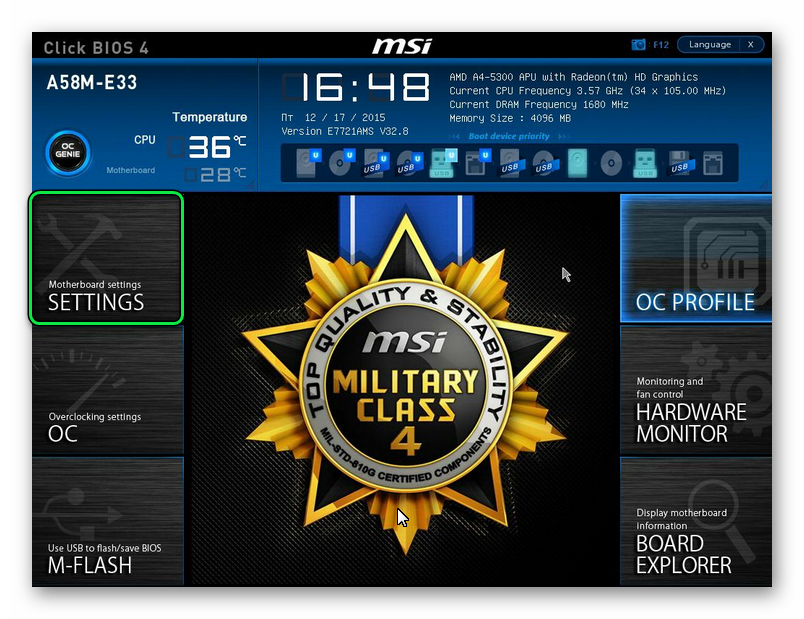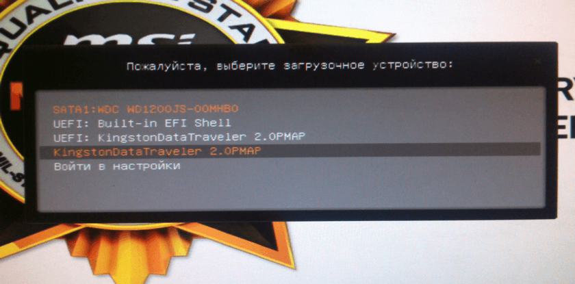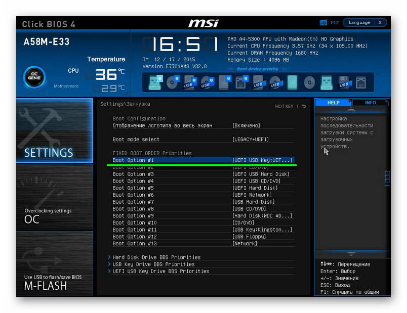 Рассмотрим пример загрузки UEFI BIOS с USB накопителя. Для примера будем использовать материнскую плату MSI — A58M-E33, которая обладает последней версией UEFI BIOS. Чтобы зайти в настройки UEFI BIOS материнской платы A58M-E33, необходимо при старте ноутбука или настольного компьютера нажать клавишу F11. Перед вами откроется загрузочное меню, в котором нужно выбрать флеш-накопитель, в данном случае это «KingstonDataTraveler 2.0PMAP».