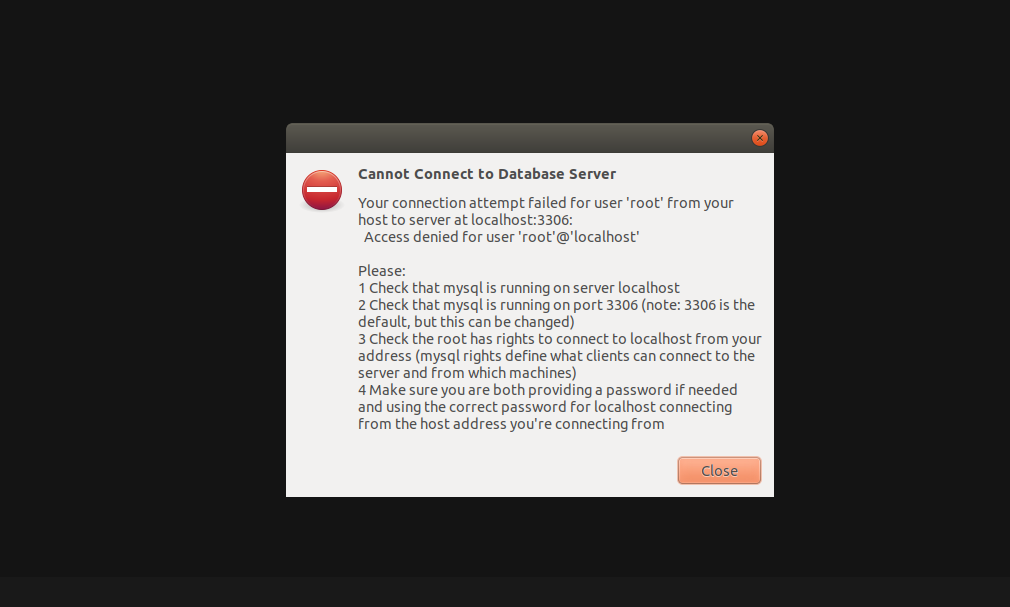Your connection attempt failed for user ‘root’ from your host to server at 127.0.0.1:3306:Access denied for user ‘root’@’localhost’