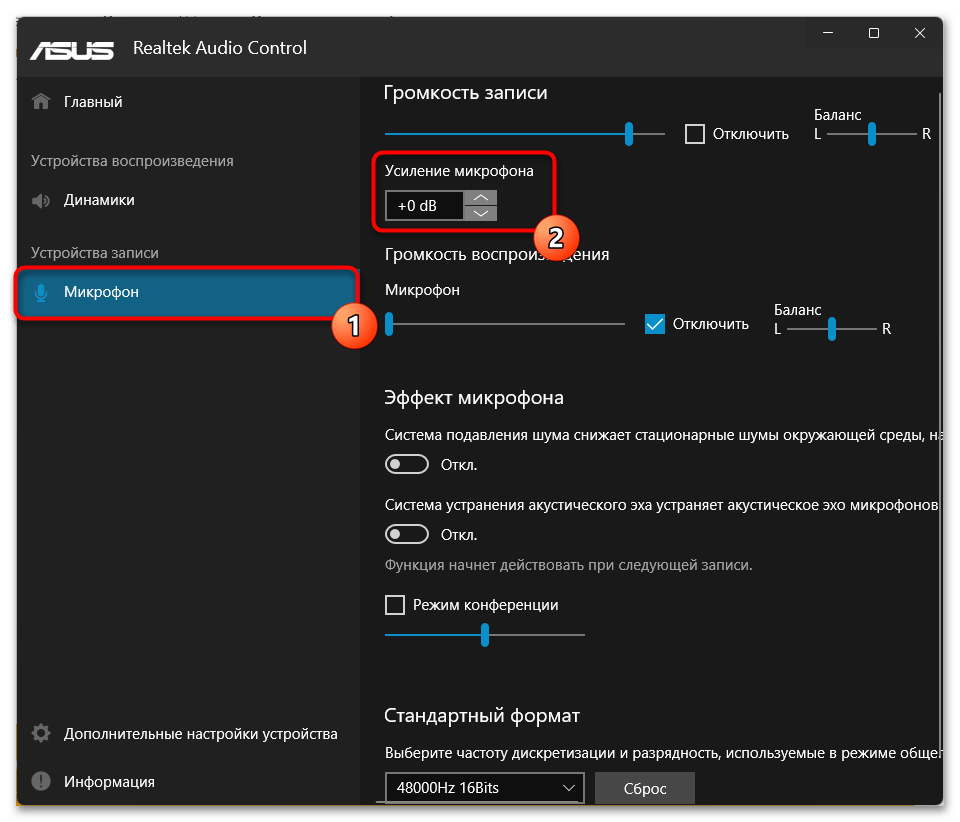 Запустите фирменное для вашей аудиокарты программное обеспечение и найдите раздел, отведенный под настройку микрофона. Здесь вам нужен пункт «Усиление микрофона» или максимально приближенное к этому значение. Формат настройки зависит от конкретного ПО: где-то надо указывать значение в цифрах, где-то — двигать регулятор.