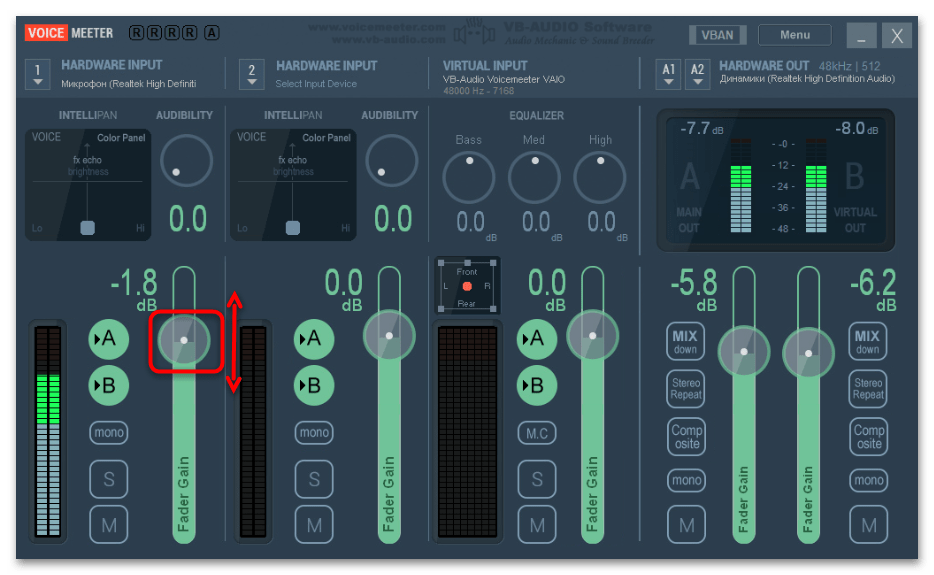 Если штатные Windows 10 и другие инструменты не позволяют тонко настроить чувствительность микрофона, то можно воспользоваться универсальными сторонними программами, которые предоставляют расширенные функции для работы со звуковым оборудованием. Одним из таких является приложение VoiceMeeter, предназначенное для микширования и управления входящих и исходящих сигналов.