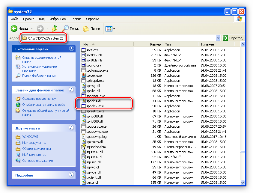 После выполнения данных действий со всеми службами, указанными выше, перезагружаем компьютер. Если ошибка продолжает появляться, необходимо проверить наличие файлов spoolsv.exe и spoolss.dll в системной папке «system32» директории «Windows».
