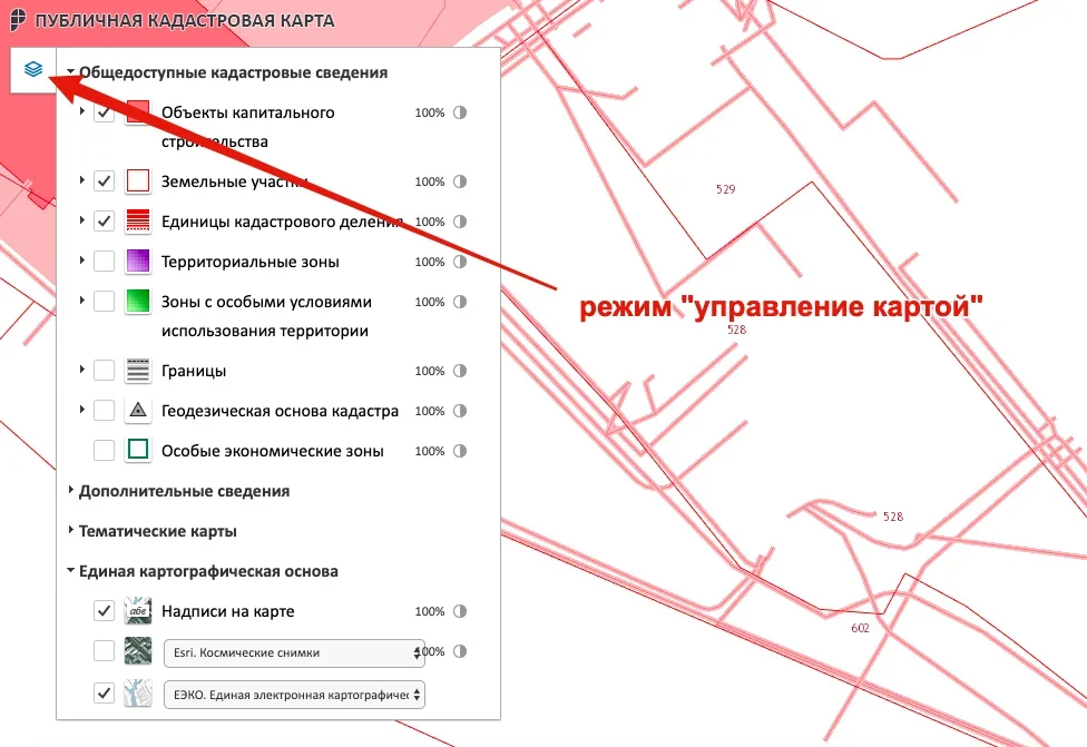 С помощью инструмента можно перестроить данные по категорийности или форме владения, посмотреть снимки из космоса или использовать другие наложения. Возможности раздела слишком масштабны, чтобы описать их в пределах одной статьи, поэтому рассмотрим лишь краткие сведения.