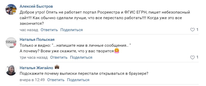 - «Сайт не работает с понедельника, пишет, что угроза безопасности. Господа, сделайте, что-нибудь! У нас сделки горят, клиенты переживают за регистрацию…», – пишет Кристина.