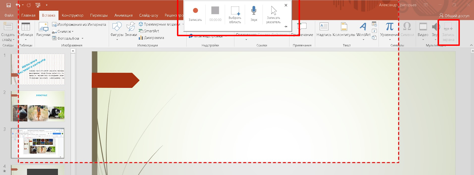 Хотите записать на видео и звук все действия на компьютере за определенный период? Воспользуйтесь инструментом “Запись экрана” в блоке меню “Вставка”, настроив параметры.