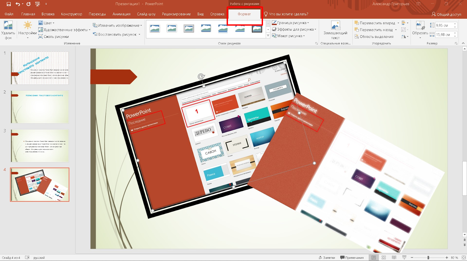- С выделенным объектом возможны такие же манипуляции, как с текстовым блоком — изменение размера, перемещения, поворот. В меню “Формат” меняем дополнительные параметры отображения картинки. Например, добавляем “Художественные эффекты” и т.д.