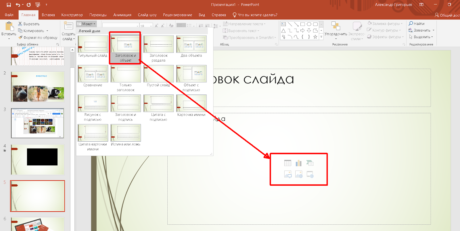 - В Ленте меню во вкладке “Главная” кликните по кнопке “Создать слайд”. Таким образом будет создан дубль существующего листа. Либо выберите в выпадающем меню страницу с желаемой структурой, например, “Два объекта”.