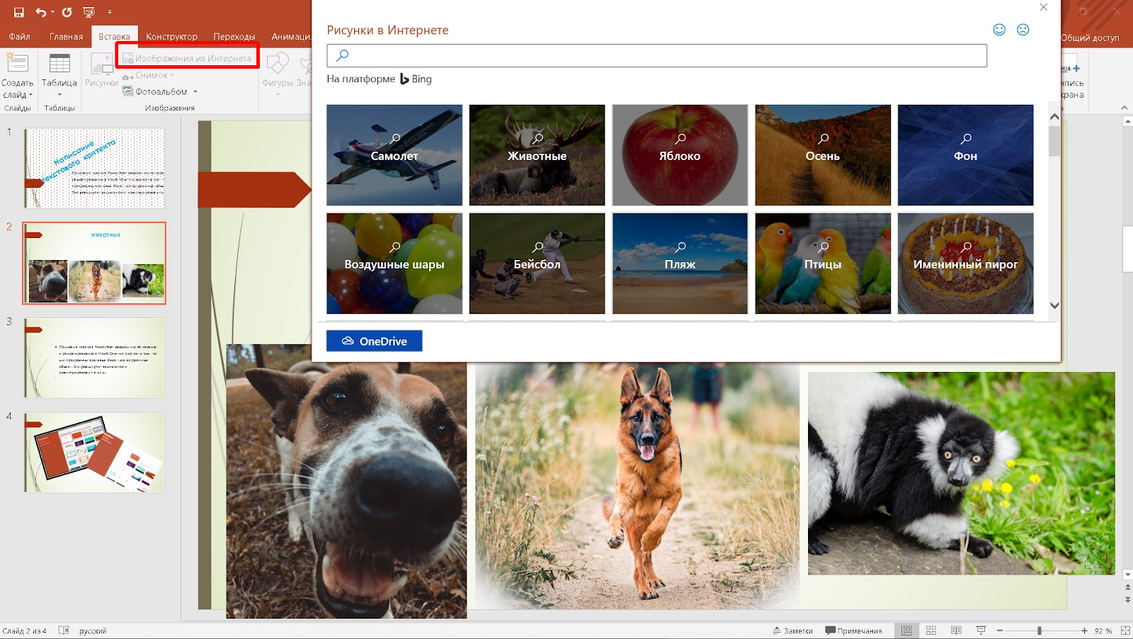 - Доступен выбор изображений по темам из облака OneDrive.
