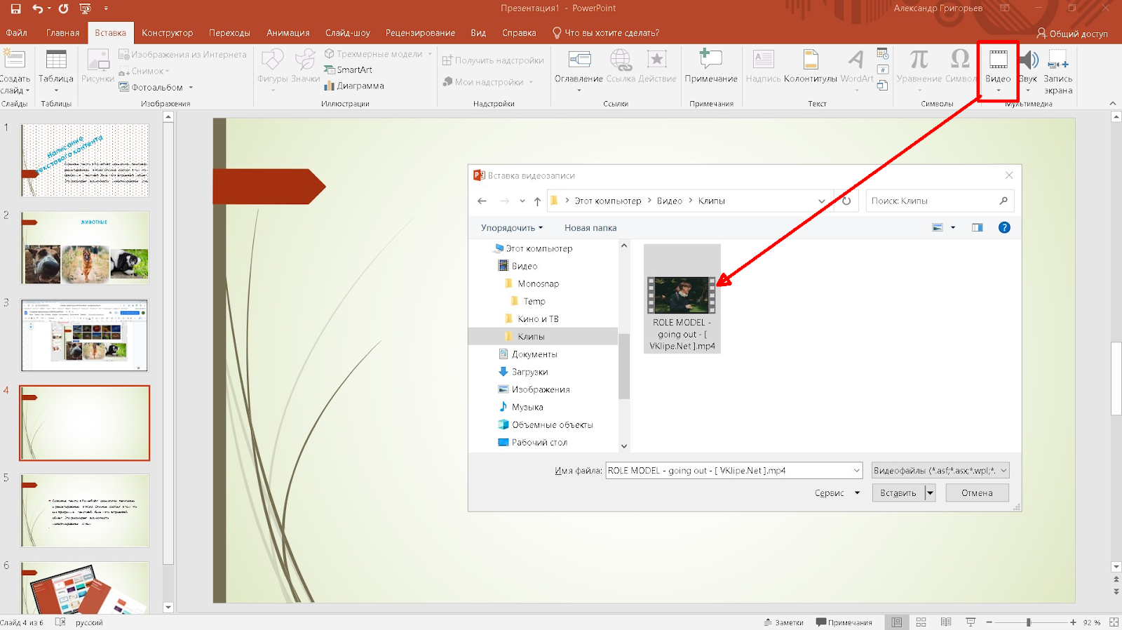 - Создайте или выберите слайд, куда хотите вставить видео. В разделе “Вставка” кликните по кнопке “Видео” и выберите нужный файл на компьютере или в интернете.
