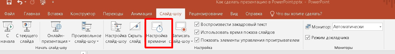 - Активируйте режим “Слайд-шоу” в меню, выберите вариант демонстрации. Для автоматического запуска с начала нажмите клавишу F5. Обязательно настройте время переходов, чтобы зрители успевали просмотреть информацию, а лектор синхронизировал выступление с показами слайдов.