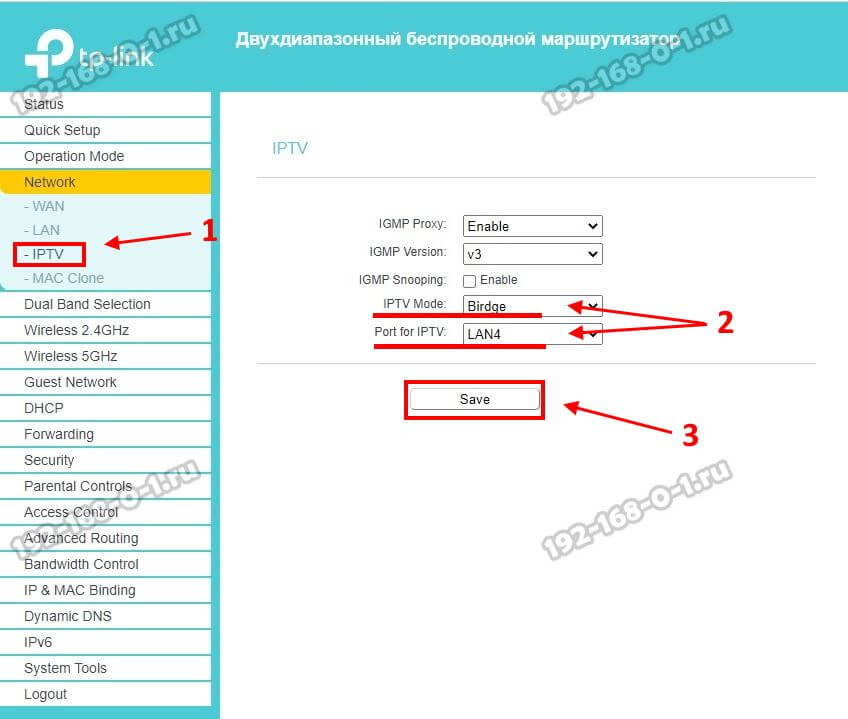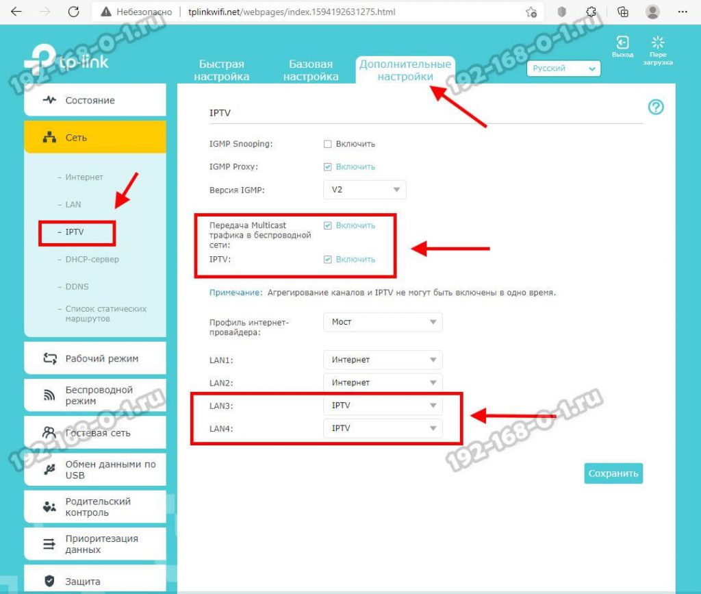 В самом простом случае, чтобы настроить цифровое ТВ от Ростелеком на роутере TP-Link достаточно только выделить один из LAN-портов и настроить его в режим «Мост» (Bridge). Делается это через «Дополнительные настройки», раздел «Сеть» ⇒ «IPTV».