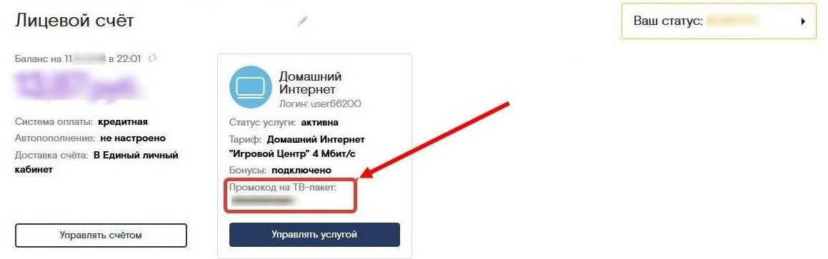 Промокод можно получить в едином личном кабинете в разделе «Домашний интернет», нажав на кнопку «Управление услугой». В опциях тарифного плана нужно найти подключенную услугу ТВ-онлайн. Если на нее нажать, то появится описание услуги с подробными условиями. В конце блока с информацией вы увидите свой промокод.