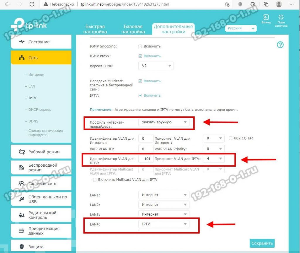 Ниже надо будет прописать «Идентификатор VLAN для IPTV» в соответствующее поле. Этот идентификатор надо узнавать в техподдержке РТ. На забудьте поставить приоритет — 4. Ниже выбираем порт для ТВ-приставки и нажимаем кнопку «Сохранить».
