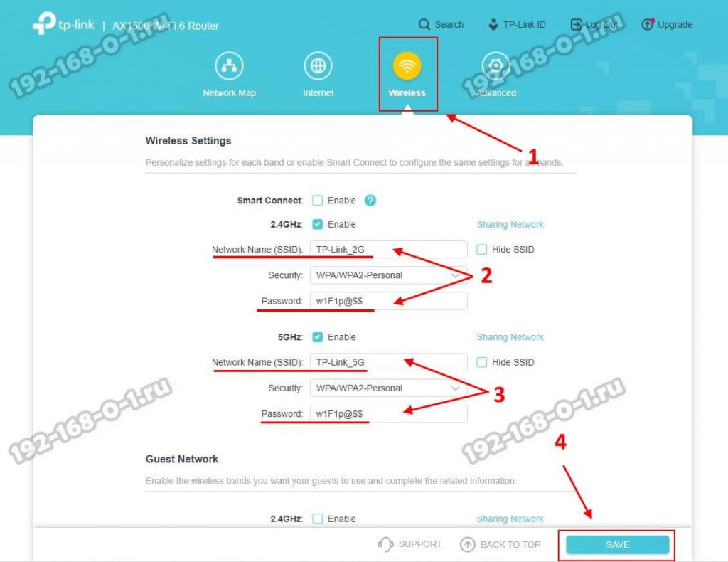 Тут для каждого из диапазонов можно задать имя сети — поле «Network Name (SSID)». Тип безопасности обязательно используйте WPA2-PSK+AES или же WPA3-PSK+AES (если устройство поддерживает WPA3). В поле «Password» надо придумать прописать пароль на Вай-Фай. Делать его надо как можно сложнее и не короче 8-10 символов. Нажмите кнопку «Сохранить»(Save).