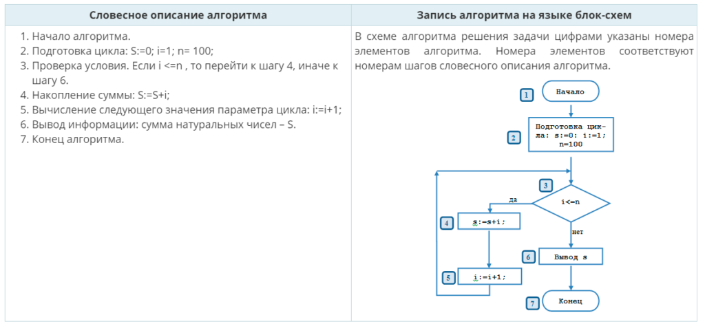 Рассмотрим задание, постановка которого связана с разработкой алгоритма вычисления суммы натуральных чисел в диапазоне от 1 до 100.