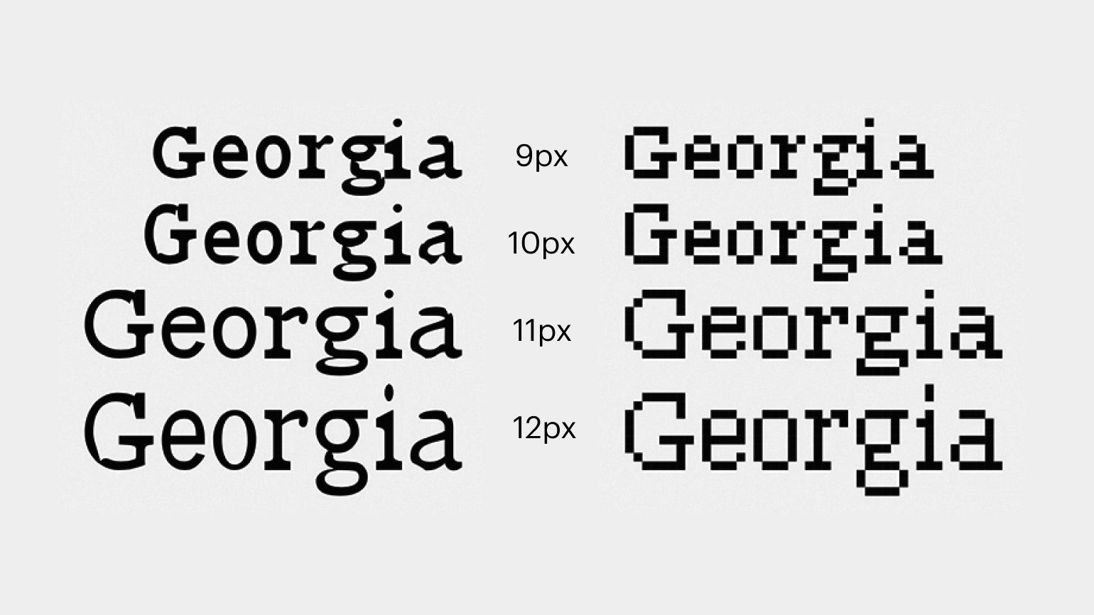 Но здесь важно помнить, что шрифт для браузеров состоит из пикселей и он совершенно не похож на те, что обычно используют в печати на бумаге. Например, вот как пришлось изменить Georgia, чтобы вписать его в сетку разных кеглей: