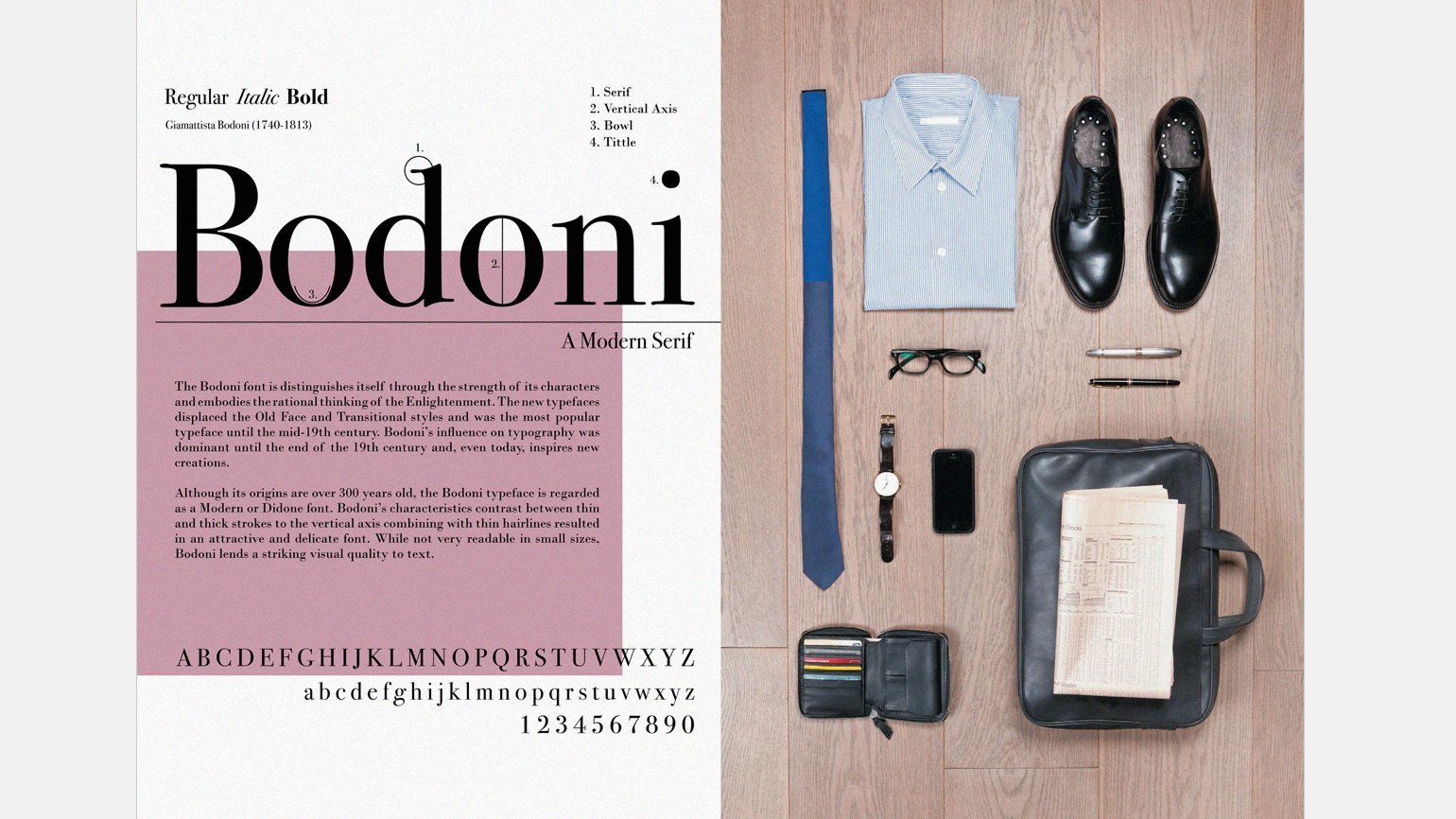Шрифт помогает настроить ожидание читателя от компании и человека. В качестве примера Шпикерманн приводит корпорации — им необходим строгий шрифт, который поможет убедить клиентов в серьёзных намерениях компании. Взгляните, как смотрится шрифт Bodoni рядом со строгой одеждой — этот набор помогает легко представить респектабельного переговорщика или гендиректора: