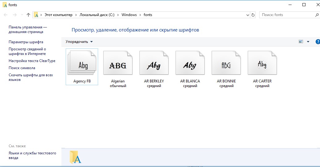 В Windows файлы шрифтов хранятся в каталоге C:\Windows\fonts. Попробуйте открыть ее в Проводнике. Если в этом каталоге вы увидите только несколько файлов шрифтов с расширениями *.fon и *.ttf, значит, стандартные файлы шрифтов были удалены и их сброс встроенными средствами (как описано выше) не поможет.
