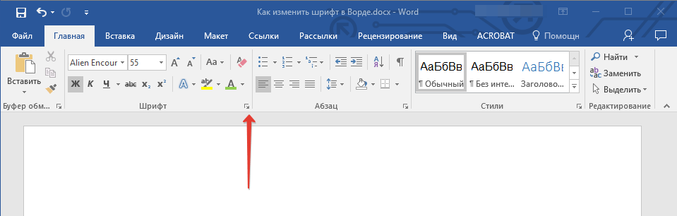 - Откройте диалоговое окно “Шрифт”, нажав на стрелочку, расположенную в правом нижнем углу одноименной группы.