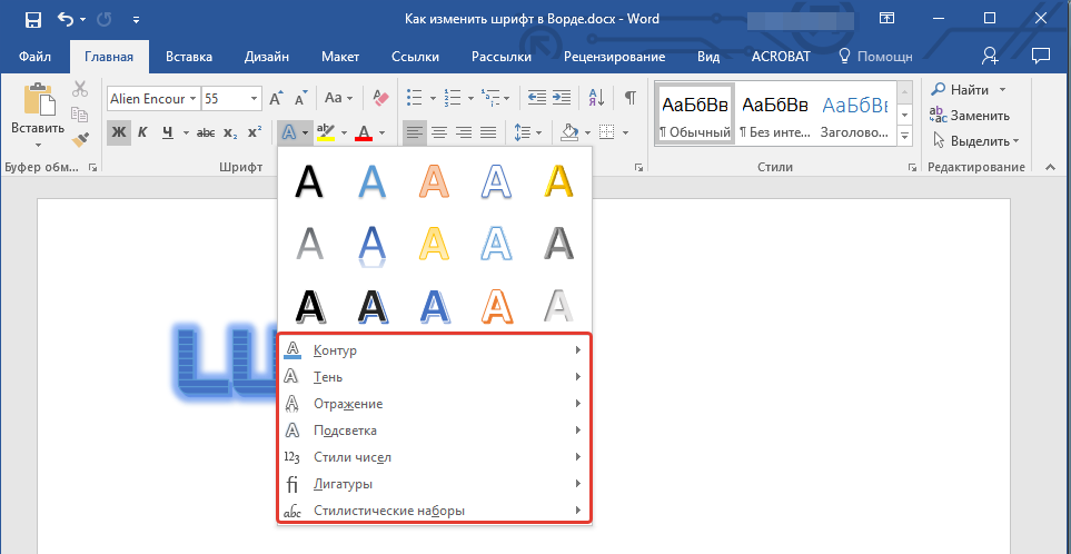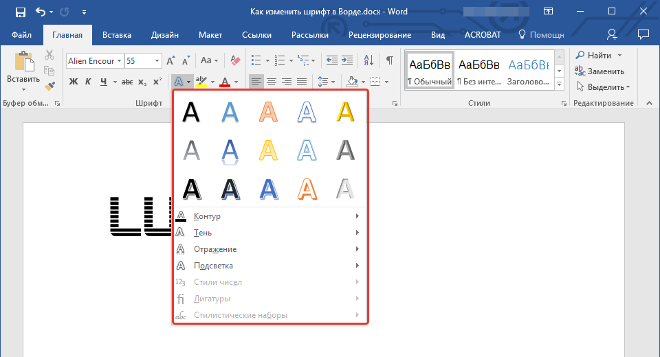 - Чтобы изменить стиль шрифта, его оформление, в группе “Шрифт”, которая расположена во вкладке “Главная” (ранее “Формат” или “Разметка страницы”) нажмите на небольшой треугольник, расположенный справа от полупрозрачной буквы “А” (“Текстовые эффекты и оформление”).