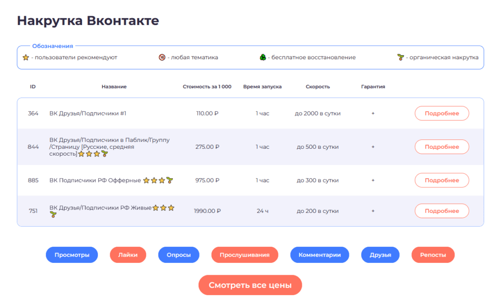 Ценообразование на накрутку подписчиков в ВК