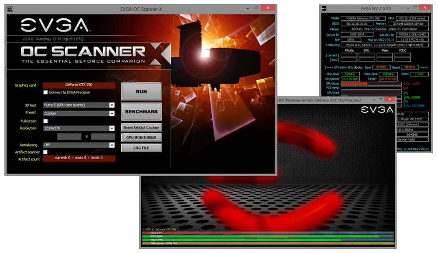 OC Scanner от EVGA — лучшая утилита от производителя. У программы автоматический модуль разгона. Этот инструмент самостоятельно тестирует GPU на разных частотах и напряжениях, постепенно увеличивая такты до тех пор, пока система остается стабильной. В итоге OC Scanner находит максимально возможные устойчивые настройки разгона для экземпляра чипа.