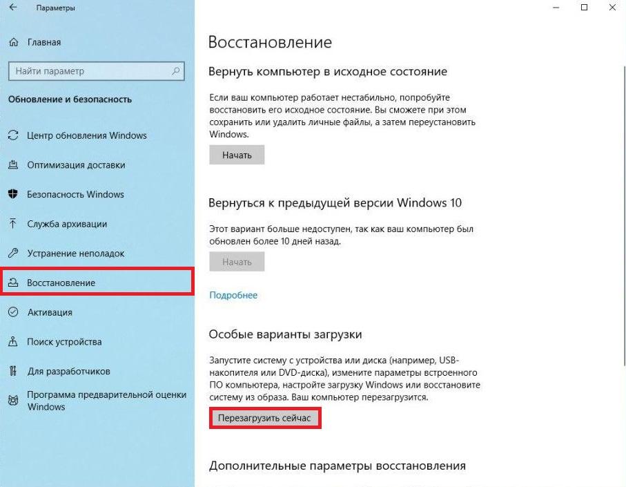 Когда есть возможность загрузить рабочий стол, проще всего вызвать меню с дополнительными параметрами следующим образом: Пуск-Параметры⇒Обновление и безопасность⇒Восстановление и в пункте «Особые варианты загрузки» нажать кнопку «Перезагрузить сейчас». Компьютер перезагрузится, и вы попадете в меню, где ОС предложит выбрать один из вариантов загрузки.