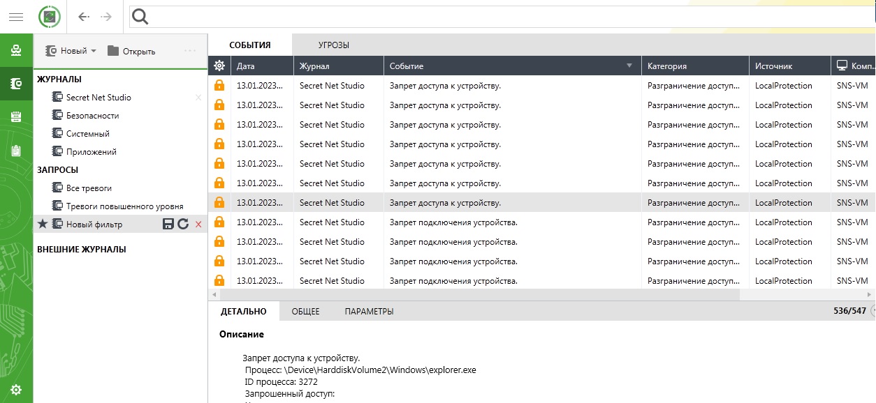События НСД это критичные события безопасности – помимо журналов они попадают в отдельную вкладку, и собираются не по расписанию, а моментально приходят как сигнал тревоги офицерам безопасности, отслеживаются и фильтруются на всех вышестоящих серверах безопасности в реальном времени. Работать с событиями НСД могут сразу несколько администраторов системы Secret Net. Для информирования об обработке события реализован механизм квитирования НСД — Можно отмечать их как рассмотренные или требующие дополнительного разбирательства, добавлять комментарии и т. д.
